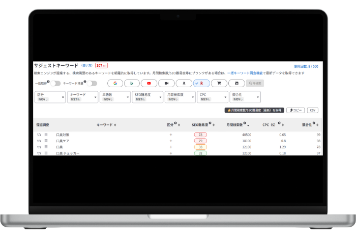 楽天の検索窓に表示される候補をまとめて取得できるため、手作業で一つずつ調べるよりも全体像を把握しやすくなります。