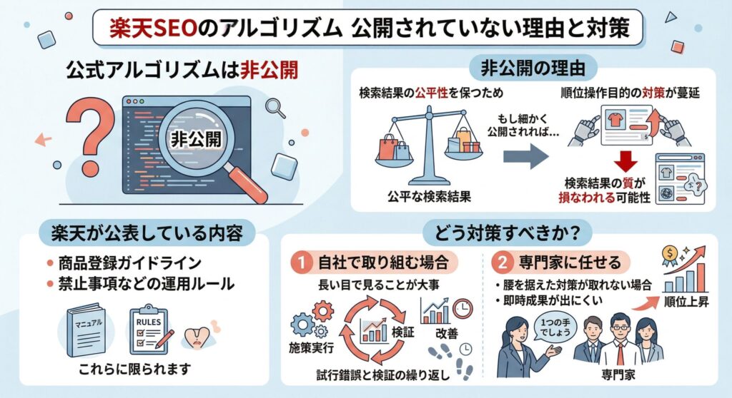 楽天SEOのアルゴリズムは公式には公開されていません。