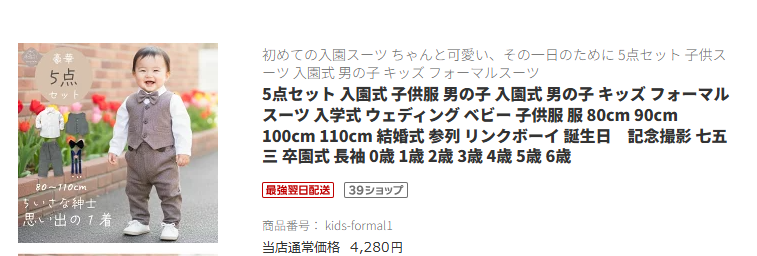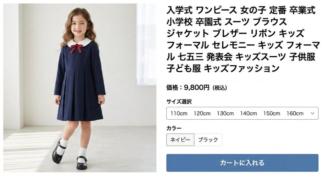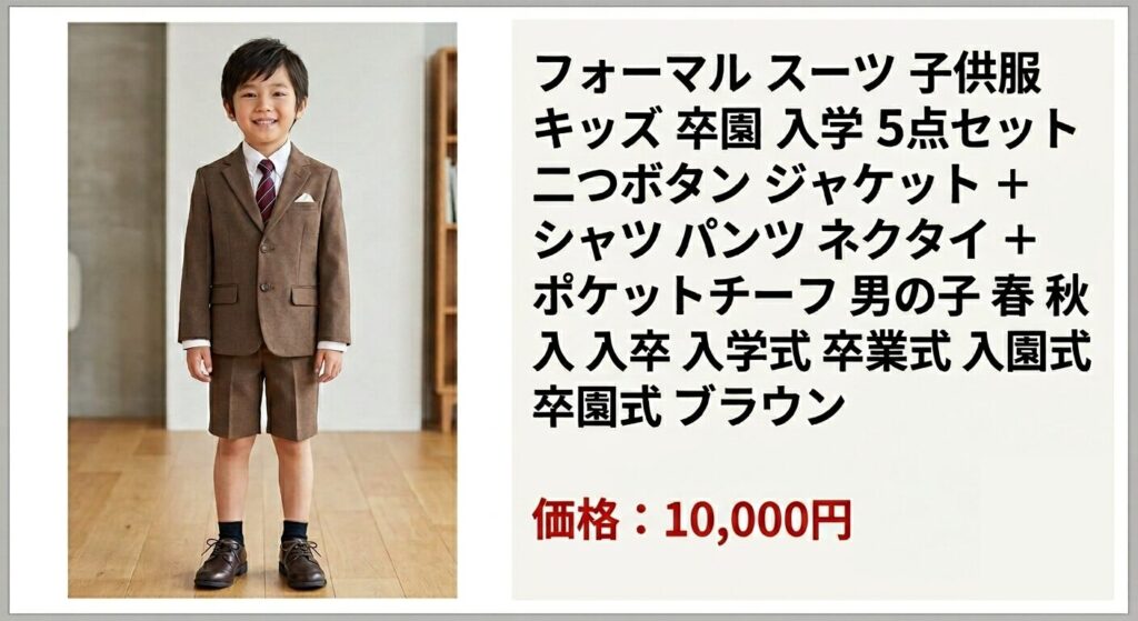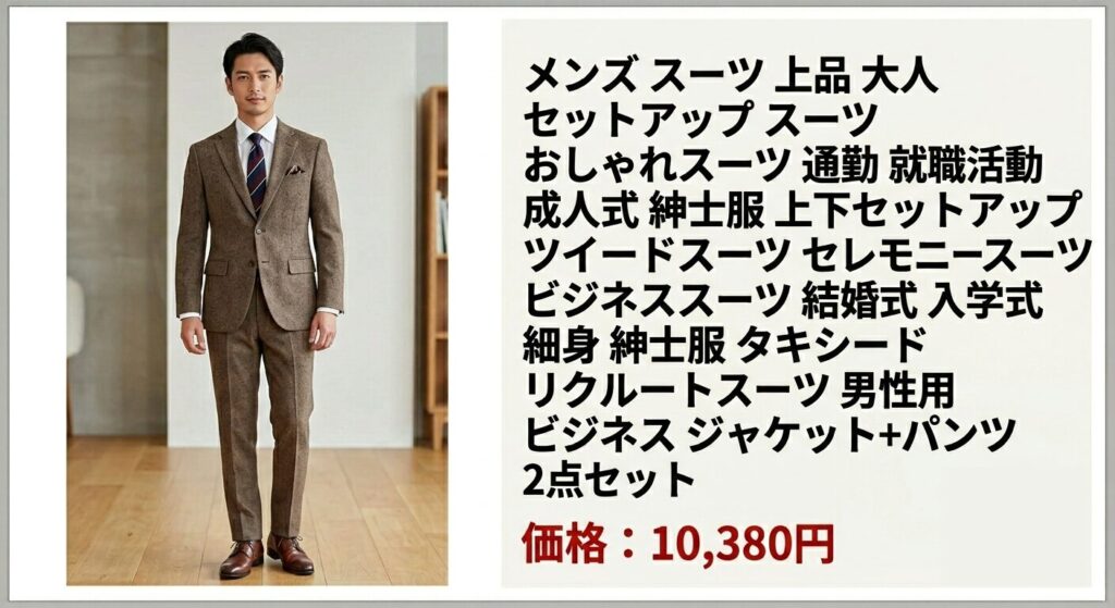 そのため、”入学式”だけでなく”スーツ”や”セットアップ”といった主要なキーワードが前半に配置されていないことが、この商品の順位が伸びにくい一因と考えられます。