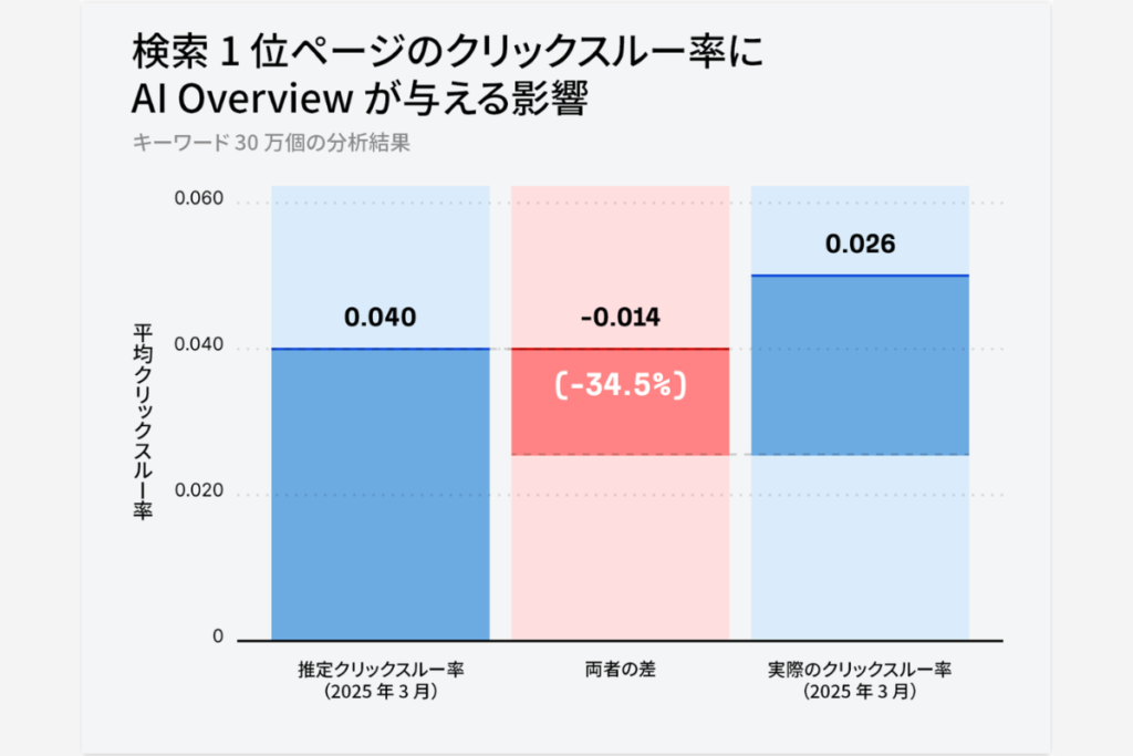 2026年2月にAhrefsが行った調査によれば、検索1ページのクリック率が34.5%下がるとの結果が出ました。