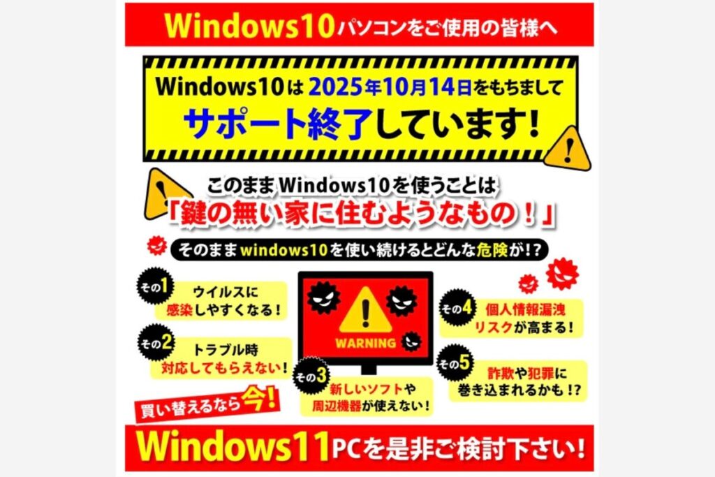また、「Windows10サポート終了」の表示もあり、買い替えを考えている人の目にも留まりやすいのがポイントです。仕様も表で整理されており、必要な情報を迷わず見られます。