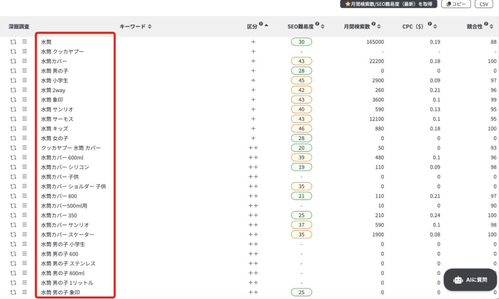 水筒と入力し、「サジェストキーワード(楽天)」を選択した上で、「無料で調査」を押します。すると、以下のように”水筒”に関連するキーワードが出てきます。