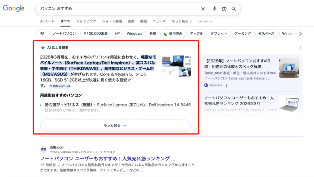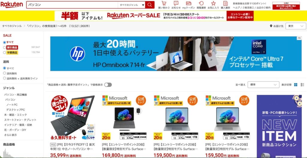 楽天SEOにおいては2026年3月時点では、AIOのような機能は確認されておらず、CTRが下がる仕組みは見られていません。以下は、楽天市場で「パソコン」と検索した場合の検索結果です。
