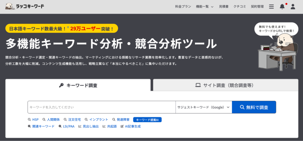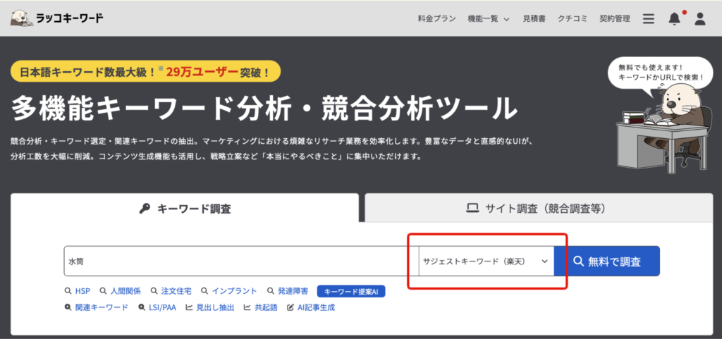 ラッコキーワードは、楽天で検索されている関連キーワードやサジェストを取得できるキーワードリサーチツールです。有料プランもありますが、基本的には無料で利用できます。