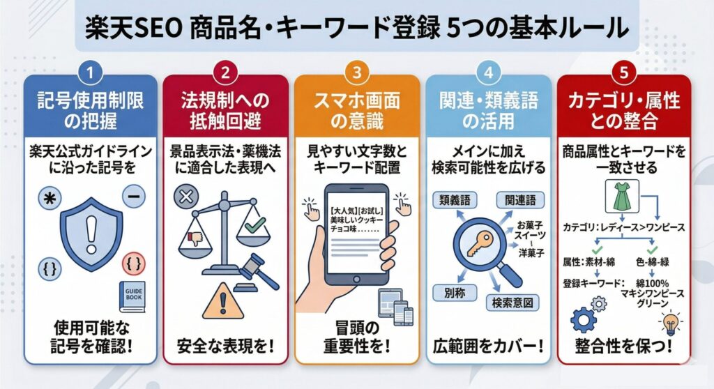 楽天SEOでは、キーワード設計を踏まえて、商品名・カテゴリ・属性・説明文を整え、検索エンジンに見つけてもらうことが必要です。