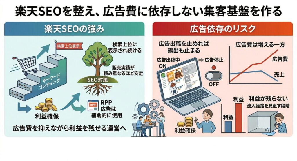 楽天SEOを整えることは、広告費に依存しない集客基盤を作ることです。